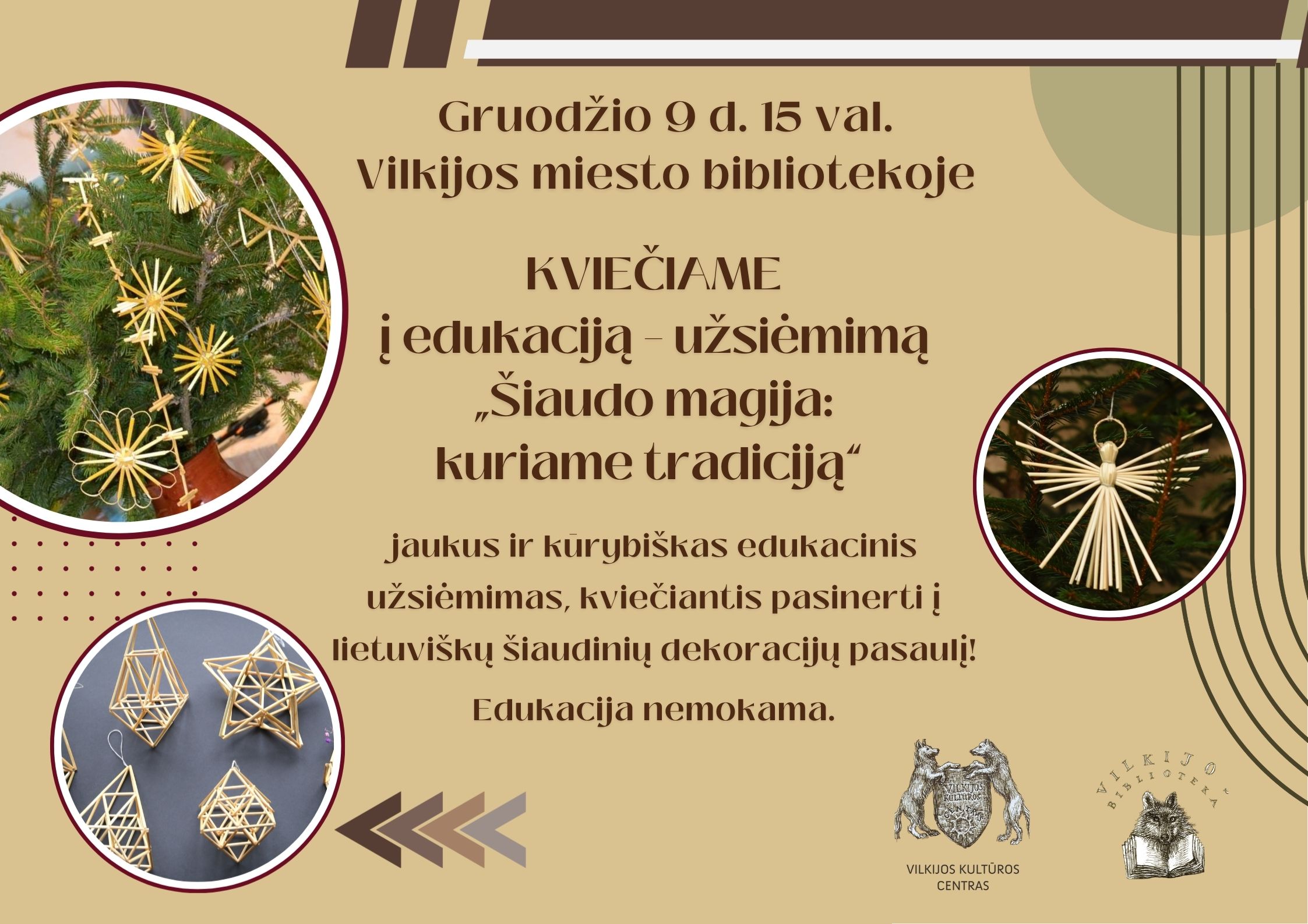 Gruodžio 9 d. 15 val. Vilkijos miesto bibliotekoje visi norintys galės susikurti tradicinius kalėdinius eglės papuošimus iš šiaudo.